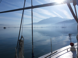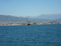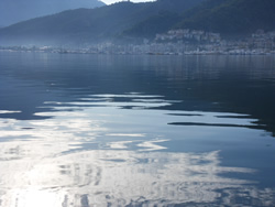 We woke to a pleasant morning, lots of dampness, the decks were soaking, they had to dry off before we could start work on the paintwork. The sun rising through the mist covering Fethiye coaxed us to have breakfast on deck, fleeces were needed of coarse.