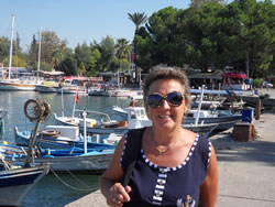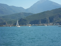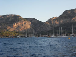 Once clear of the islands the wind becomes steady, our headsail alone giving us a good three knots on this beautiful morning allowing us to sail into Fethiye Harbour. We drop anchor off the hotel pontoon and go ashore to find out the arrangements with regards to our berth. I was a little surprised as to how many visitors are on the pontoons, still vacationing? We then returned to Sailaway, unfortunately on the way back we hit some thing solid in the water shearing the drive pin on our out board engine propeller - some pour turtle we suspected as we were in ten meters of water? There must have been no serious damage to it as it did not even re-surface? Due to the number of visitors we could not secure our preferred, final resting berth until tomorrow? We want a berth facing into the prevailing winds as we berth "bow too".