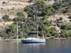 We were just saying to ourselves how pleasant it was being one of only two vessels in the bay, then the gullets began piling in, all coming in from the seaward entrance of the Limani, it was a shame to see their guests dressed is fleeces and sweaters. It would have been chilly out at sea today, there are strong westerlies due to blow for a while, we are glad we moved when we did.