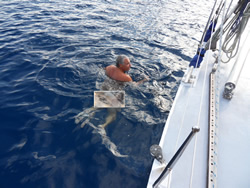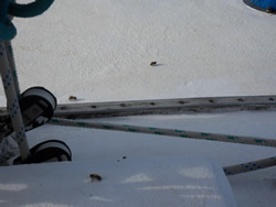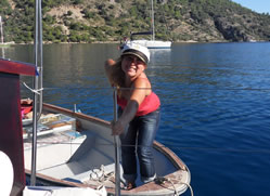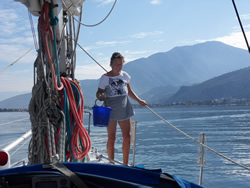 As we sat on deck we at first, noticed a wasp or two, before long there we dozens of them settling on any thing they could even us? In a short period of time we realised they were in fact resting, the unlucky ones were in the water all around Sailaway. At first instinctively Ann swatted them, they loved my yellow fleece at one time I had about five or more on me? Very quickly we realised there were too many, probably a swarm for some reason, crossing the water from the Fethiye area making for the nearby shore line behind us, some making it, a lot not. We now let them settle, rest and leave us, one could not put a hand or foot down without checking for wasps first! In time they left and we began work, unfortunately Ann later stumbled on one, standing on it, in defence it stung, the sting was removed and the foot treated.