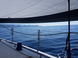 Within the hour a very light breeze develops, up goes our canvas and off goes the engine, we are doing only a knot or so but we are in no hurry, what better way to enjoy our lunch? We are passed by vessels motoring in both directions, they wave as is the norm, but they look at us a little strange sitting almost stationary in the water.