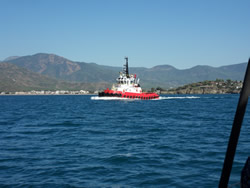 On the way through it's gates we are met by a large, working, ocean tug, on it's way to help "some thing"?