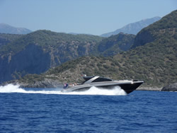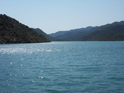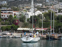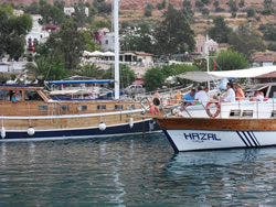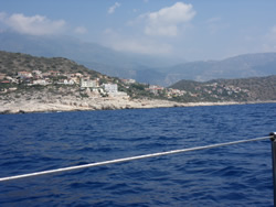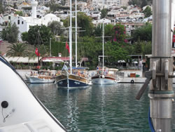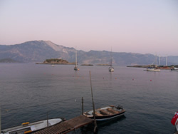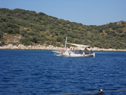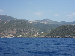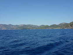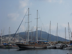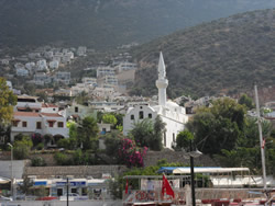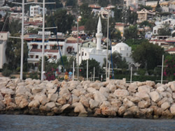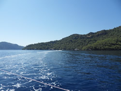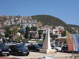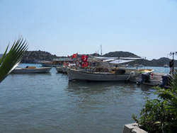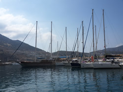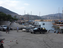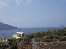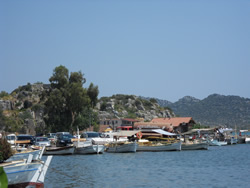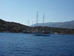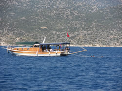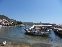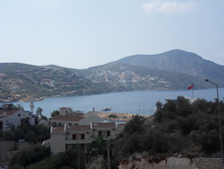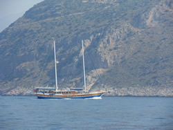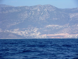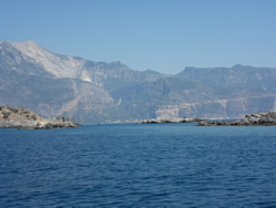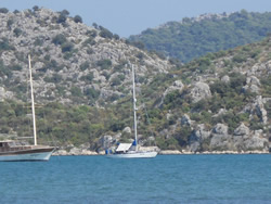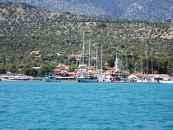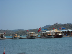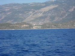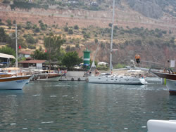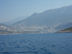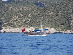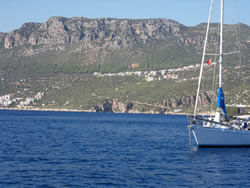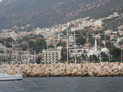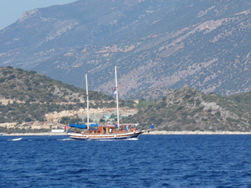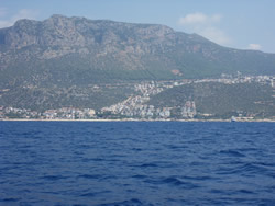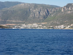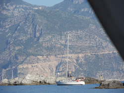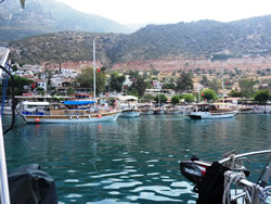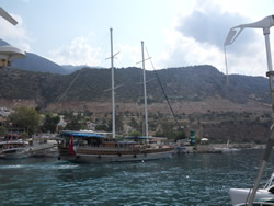 We did not sleep well, during the night the wind got up from east within the bay, this put us "a beam" (sideways) to the slight southerly swell. The constant twisting of one's body as we lay in our bed was uncomfortable to say the least? The numerous gullets that entered the harbour last night to drop off the numerous cargos of tourists, and the information we had received on this small harbour drew little attraction to us - "too touristy!" Our plan was to shoot into Kalkan in our dinghy, have a quick look around, then pick up a few bits and pieces from the supermarket then return to Sailaway and leave. The winds may how ever influence that plan as they were due to be against us but only forecast as light? The area in which we had anchored was not safe in our opinion in any thing other than light winds and the bay offered no acceptable alternatives?