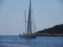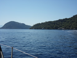 Once past the beach we sail inland we are to make our way through a channel between Yali Br. on the main land and Catal Ada, an island offshore. As we approach the channel, a couple of miles yet to go the wind falls off as it does every evening at this time, on goes the engine.