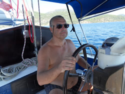 Our destination today is a series of anchorages just beyond the eastern corner of Fethiye bay, a short trip of fifteen miles or so? This is to be an over night stop as we make our way to initially Kalkan, then Kas. We wait until mid morning to leave, to allow some wind to develop to provide us with a few hours of good sailing, the wind is not looking too promising today? We collect our shore lines and tidy them and other "bits" away, we then release our final line off from the buoy and make our way across the Limani. Some have commented that I look a little like Robert Crowe in "Master and Command" - just wondered if you were truly awake?