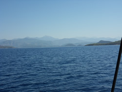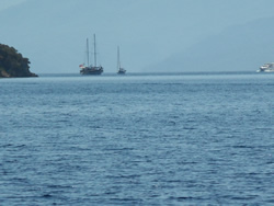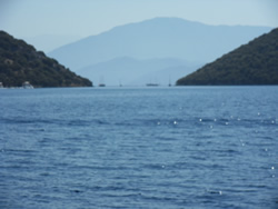 As we cross the Limani, the mountains to the north are still covered in mist, we are to pass through the channel to the south of Domuz Adasi and then across Fethiye Köfezi. The vessels on the water are slowly increasing in numbers, as we approach the channel wind can be seen on the other side.