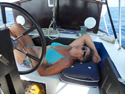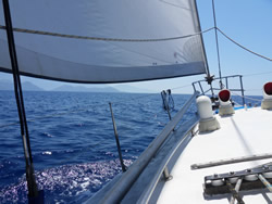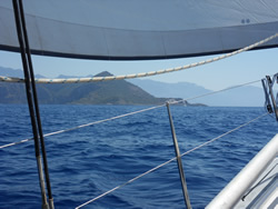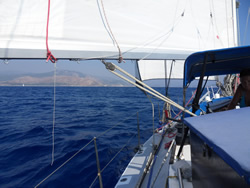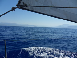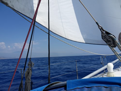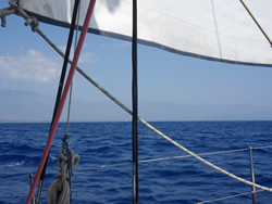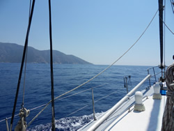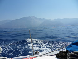 The wind was now more consistent, and our sailing marginally steadier, how ever the light wind came dead astern to us. In this position it was too light for us to sail if we maintained our required heading, it would not even keep our canvas full. So, we changed coarse and sailed the best coarse we could for the wind available, and kept the engine off. We watched the coastline disappear, we would change coarse later and return to it.