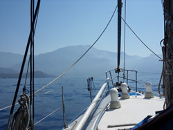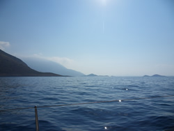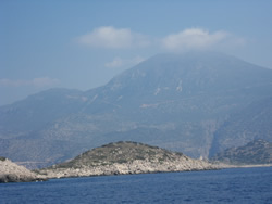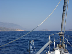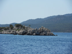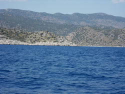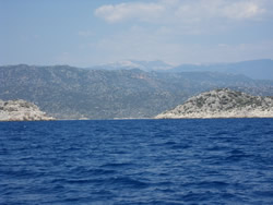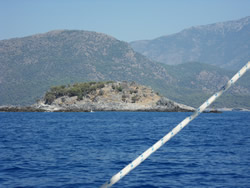 We left smartly, without even a hint of a fouled anchor and soon, under engine put Kalkan behind us. The anchor had brought up mud with it, Ann quickly washed it off our decks. Our trip was only a short one of approximately 20 miles or so along the coast. We rounded "Inch Burun" and turned east to make our way through the numerous small islands ahead of us.