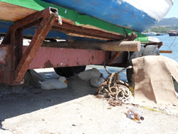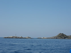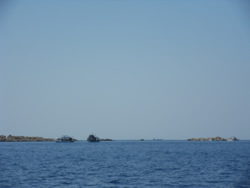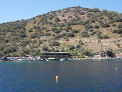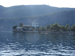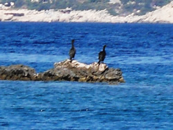 We were now finished with this area, time to move on, we started our engine about 1000, made Sailaway ready for the fifteen mile trip, pulled up our anchor and left. The water taxis had already began bringing the tourists to the beaches, as we headed north to exit the Limani we passed "The Fish House" a strange place, no more to be said of it? As we passed the large reef that runs out into the Limani two cormorants stand guard, or perhaps they were there to ensure we leave?