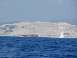 We, in time turn around Kötü, our last heading being due south for some time up till now, we now head south east. Ahead of us lies Yedi Burunnalr (seven capes) and Patara Beach, but more importantly "wind" from the north west begins to develop, and of coarse up go the sails and off goes the engine. Our progress is slow as the wind is light, but this is how we prefer to travel?