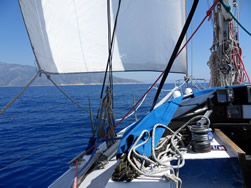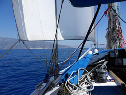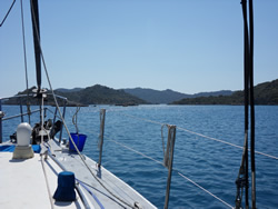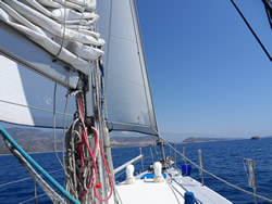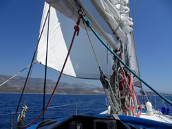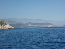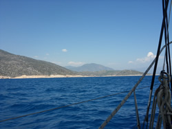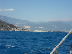 We motor the short distance round the island, turning east and putting Kekova Roads to our stern we roll out our genoa, the wind is fairly stiff now, our headsail will be sufficient to get us across the bay in due time.