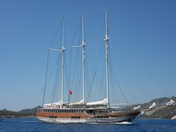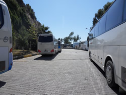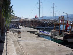 The port is as described, basically a mole/wall offering limited protection from the prevailing winds. There were gullets anchored both behind and outside of the wall, the wall itself was one continuous row of day trip boats and coach's, as one left, another would return. We decided to anchor to the west of the gullets, outside the protection of the wall but the winds were forecast as very light, this also meant that we would be well clear of all the harbours daily activity. The winds always peak in the middle of the afternoon we would make our decision to stay then, but all looked good for us.