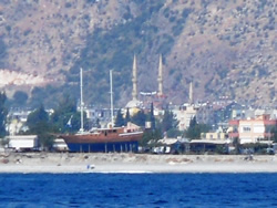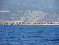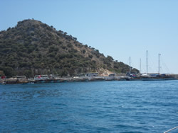 In our pilot book it is defined as almost a "no go area" due to the commercial traffic, however it does describe many ancient Roman ruins lying off the river behind the harbour of today. We decide to visit, we may or may not stay over night, we will access our position once there. Andraki is only a couple of miles off, if we need to move on the only destination for us would be Finike, or return until tomorrow? We get our selves and Sailaway ready for the trip to Finike just in case Andraki is not suitable for tonight, we leave about 1130 hours. We make our way round Ashil Adasi through the south channel, once round the island we need to head basically due east across the bay.