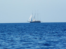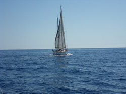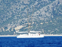 We continued slowly on our way, passed by in both directions by numerous vessels motoring - must be on a time schedule? Eventually the headland to the south of Finike became visible to us, as we approached it the wind stiffened considerably.