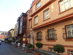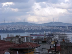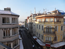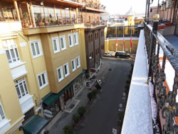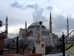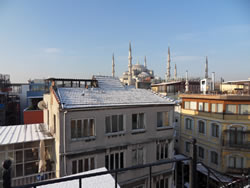 We arrive at the hotel and are greeted well, our 95kg loaded into the hotel reception then taken up to our room by the hotel staff. Entering our room our worst fear was completely eliminated, we have used hotels in many places out of season and they have been so cold, at time even unbearable causing us to relocate. Not in this case, the whole hotel is very warm, perfect in fact, they boast "heating on 24 hours" and that is exactly how it is. We are in the "Pension" our room and facilities are great, we wander up to the breakfast room on the upper floor, they have a roof top that is utilised in the summer, the open doors allow us to view our surrounds. From the roof top we can see the Bosporus, The Blue Mosque and the Hagia Sophia Museum, all are as close as we hoped they would be.