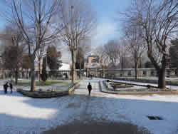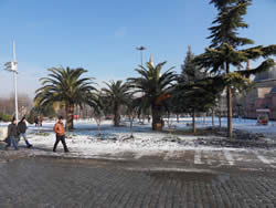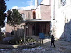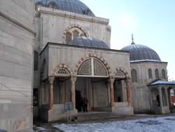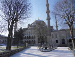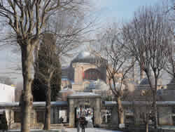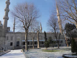 As the hotel is in very close proximity, it takes us no time at all, even when so slippery under foot (roads and pathways are not treated here at all?) to reach the Mosque, a very impressive building indeed. The name of Blue Mosque (or Sultanahmet Camii) come from "Sultan Ahmet I" (1590 -1617) the pious although predominantly believed to be "very unlucky" sultan who had the temple constructed as an attempt to appease Allah for his loses against many armies from both east and western flanks of the Ottoman Empire. The Mosque took just over seven years to construct, just as it neared completion the unlucky sultan died of typhus at the age of 27?