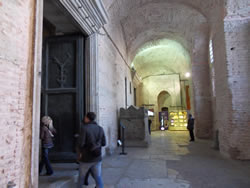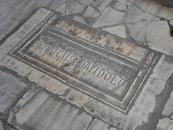 There is only one grave declared within, that of "Henricus Dandolo", the Doge of Venice and Commander of the Latin armies that invaded Constantinople.