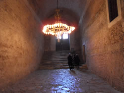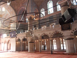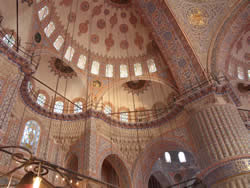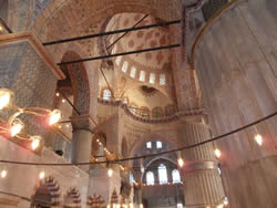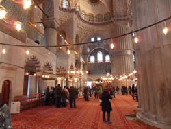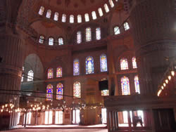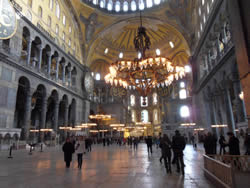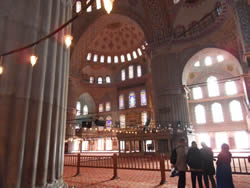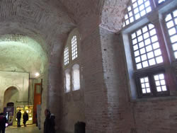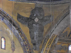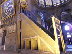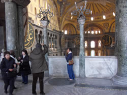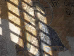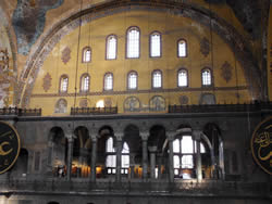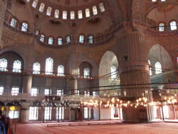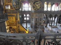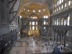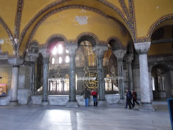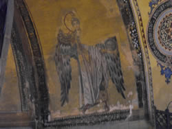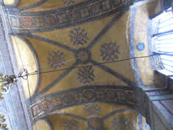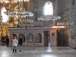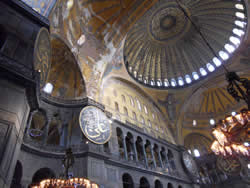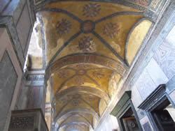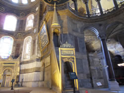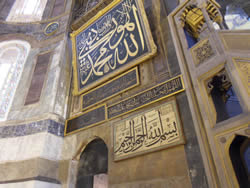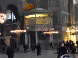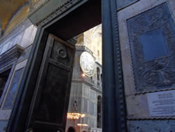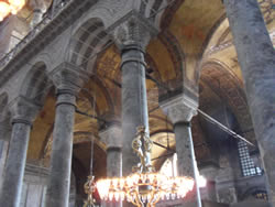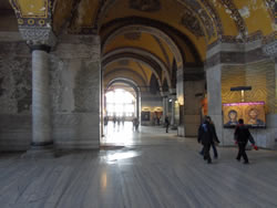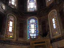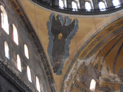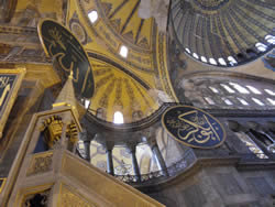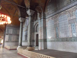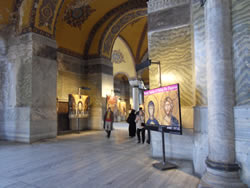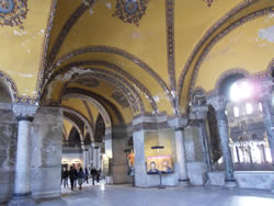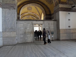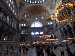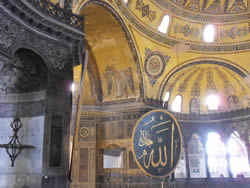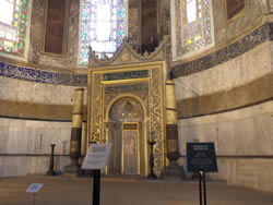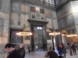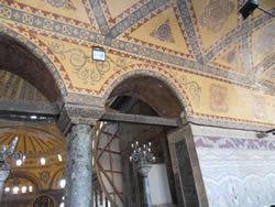 As one initially enters the great entrance hall the extravagance and wealth put into this place of worship is evident. The entrance to the main section is via the Imperial Door, bordered with religious mosaics. Once in the main hall, the contrast or confusion of Christian and Muslim believe is evident all around, the Christian, predominantly uncovered during recent renovation