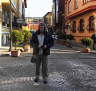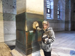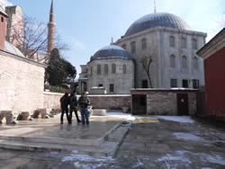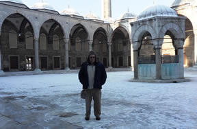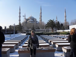As we exit the hotel our attention is gained by a couple of young guys in a nearby shop with the use of a snowball - our first of the year! We decline their offer to visit their store and continue on the short walk to the Blue, or Sultanahmet Mosque. I wager you ladies adore my hat - well, at least it is warm!