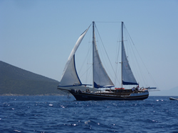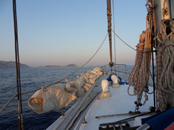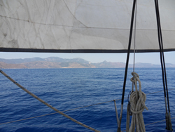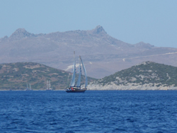 We left in a calm but ahead we could see a gullet making way under sail, so there is definitely wind out there to be utilised? We are not too confident, as, in the Med. it is very much "feast, or famine" when it comes to wind strength!