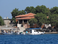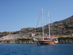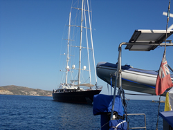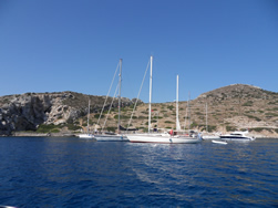 Within half an hour a large British flagged vessel arrived, he dropped his anchor and sat behind us, we got talking to the skipper, on his way to Kos to pick up his "Big Boss". I have finished the engine, ran it up to temperature, all was good to go. I explained to the skipper that I believed he was sitting over our anchor chain. Within minutes he was in the water and confirmed my belief, he would move a soon as we were ready, he was just going to have his lunch, then they were leaving anyway. We decided to let them have there lunch as we thought we might miss something interesting in the anchorage if we left too early? As it turned out we did not, the skipper finished his lunch, rounded up his fellow crew waved goodbye and left, we followed them out of the anchorage.
