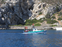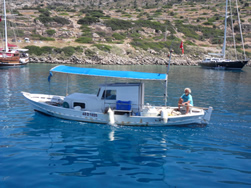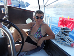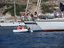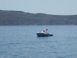 As Ann kept her self busy on deck she saw the arrival of a large, powerful power boat, must of cost a fortune to run alone with today's price of fuel? One of the unfortunate crew members jumped into the dinghy to tie the vessel back to the old harbour wall. Well, the owner must have plenty of cash for fuel but not enough to have fixed a hole in the rib, one side was completely flat? The problem was obviously known about as they had a foot pump in the dinghy ready to re-inflate it - it all happens here at Knidos?
