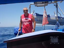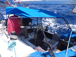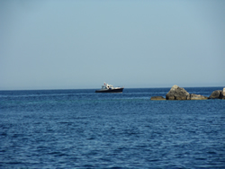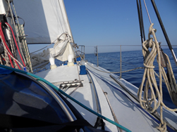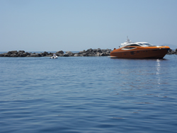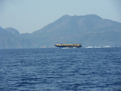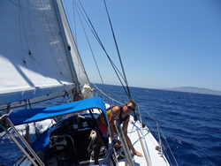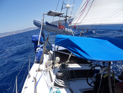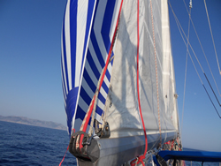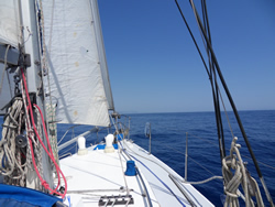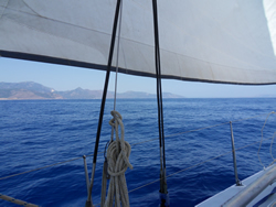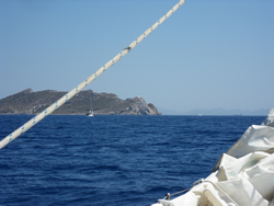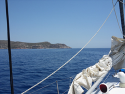 The wind begins to stiffen, soon Sailaway is carrying too much canvas, adjustments are no longer enough to keep her stable, especially in the strong gusts. We reduce first our mainsail, then in time our headsail, keeping our speed to a maximum with as little strain on Sailaway as possible. We were able to sail at speed for a good three hours, the journey a wet but fast one as the waves build quickly and break over the beam into the cockpit, we duck behind the canopy as we see them coming - passes the time anyway? Then, as quite often is the norm in the Mediterranean, the wind literally disappears without warning, on goes our engine and we motor sail hoping for wind ahead?