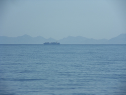 As we got further from the coastline light winds did appear from the south, up went our sails and off with the engine. Our progress was slow, only 2-3 knots but at least they were silent. It is hard to explain the peace felt went that engine goes silent? The islands began to clear through the mist, as did the heavy commercial traffic ahead.