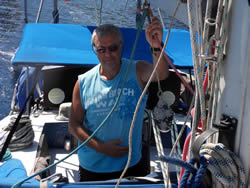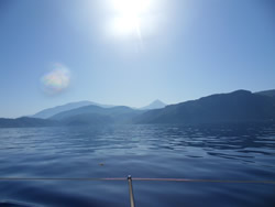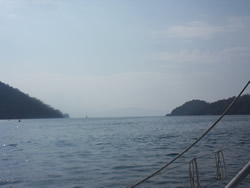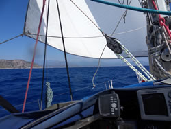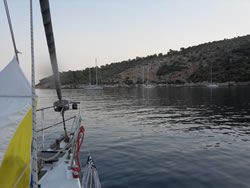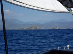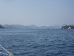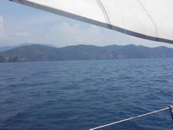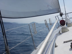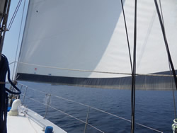We pass the local traffic, many small open fishing boats, the tourist traffic very sparse at this time of the morning. We are a little early for the prevailing winds but spend an hour or two managing our frustrations with local light breezes. Eventually around 1100 hours a steady wind pattern develops, our canvas is out to stay.