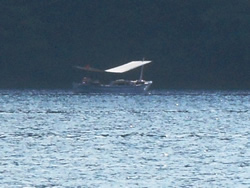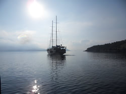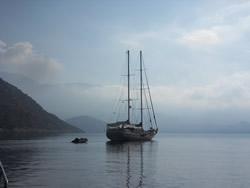 This morning we are engulfed in cloud, rain can be seen to the east of us. It obviously does not stop the holiday traffic an early gullet approaches the anchorage through the rain and mist.