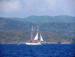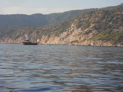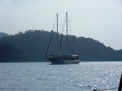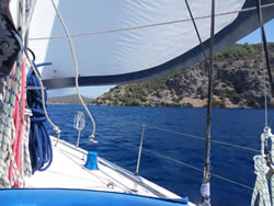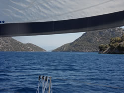 As we approach Catal Adasi and the channel taking us into Yali Limani and the Kalkan area we drop our mainsail and watch a gullet offering assistance to a broken down, small, local boat. In time it passed us with it's engine running good as new.