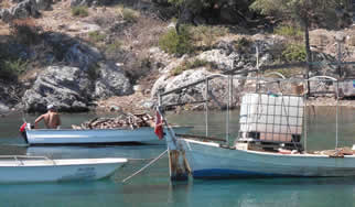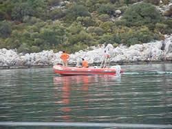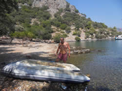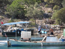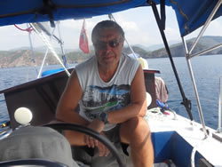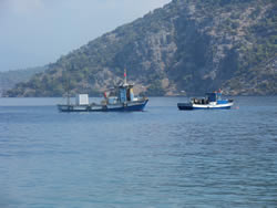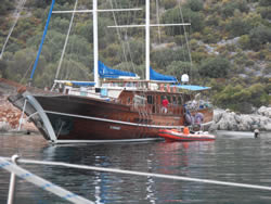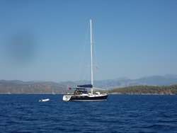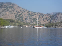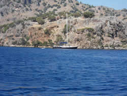 We chat about our ideas as we squeeze in another cupper, as we do the Coast Guard arrive and begin checking the documentation belonging to the gullets. To our surprise we are also approached and comments are made about our faded Turkish courtesy flag. Looking up at it we have to agree and inform them that we are due in Kas on Monday, we shall replace it immediately. This is the second formal approach about our flag in a month by the Coast Guard, the first about a "weathered flag" in Fethiye Körfezi - a very nationalistic race. It was not an unreasonable request, looking around the anchorage and later in the marina we are amazed to see every Turkish vessel we see flies a Turkish flag in good condition, not weathered nor faded - proud of their flag, good on them. We will replace ours as soon as possible.