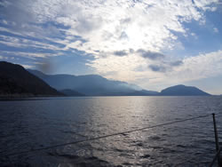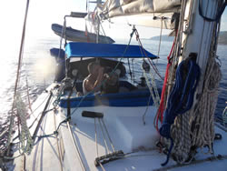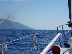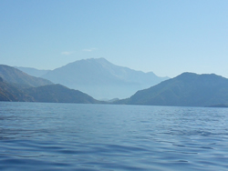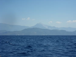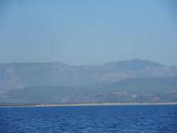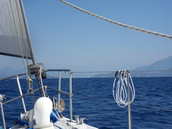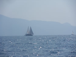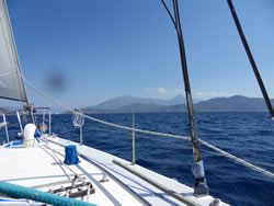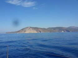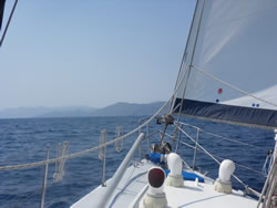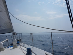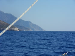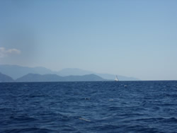 Once out into open water we raise our mainsail and roll out are genoa, the winds push us at a steady 6 to 7 knots east towards Kizil Adasi, the mountains to the east partially hidden in the mist.