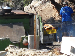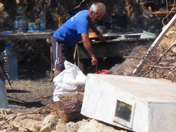 In the far corner we see where the majority of the cooking is performed by the father and son, as we watch the father prepares some form of casserole and of coarse bread cooked with olive wood, the wood does give the bread a lovely taste.