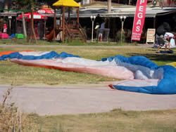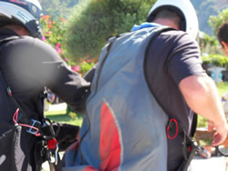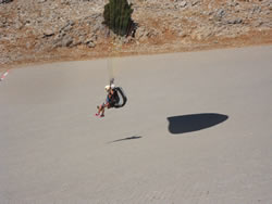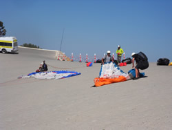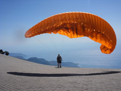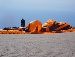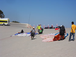 The process is quite simple, one lays the parachute flat on the platform and one encourages the wind to fill it. Then, as it does a "runner" runs down with you to the end of the platform, he stops only a couple of meters before the end because he does not have a chute, and you disappear over the edge.