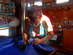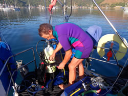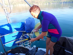 With our gearbox repairs long behind us it is time to replace the shaft anodes we had to cut off the propeller shaft to allow us to complete the repairs. This had meant the repairs could be completed in the water avoiding an expensive lift out. Ann is to take her first "Commercial Dive", not that she is to be paid for her services but, her assistance greatly appreciated. We complete the anode installation early to avoid as much traffic as possible only having to manage the wake of the odd passing vessels
