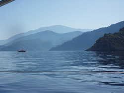 It is quite a solemn occasion, we are certainly glad to leave Fethiye but not begin our final trip for some time? The water is mirror like, we are at the great harbour entrance before the first trip boat joins us, from then on a continuous train of vessels servicing the tourists.
