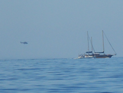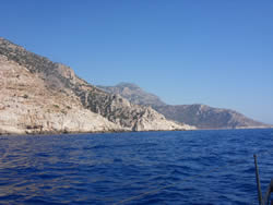 As we arrive in open water, leaving the Körfezi we see a military helicopter "buzzing" the vessels in front of us traveling east to west. There has been an noticeable increase in surveillance with regards to "illegal's", in fact we watched the coast guard impound a sailboat with a number of people on board. It was escorted to the Coastguard quay a number of days ago and was still there when we left? As we approached Dökübasi we check the weather for the next few days, it is to be similar with very little usable wind for our intended destination. It was only lunch time so we motored on as we could reach Kalkan just after dark, putting the majority of the trip behind us.