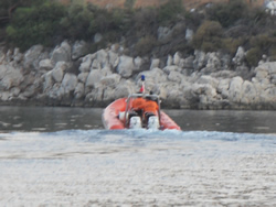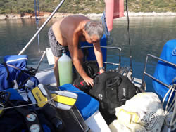 This morning as the sky brightens we plan to complete our final dive of the season, to explore a nearby cove and its rocky, shaped cliff surroundings. We prepare our equipment, load it into the dinghy and off we go for a couple of hours play time.