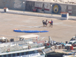 We leave Sailaway out at anchor, to the east of the harbour/marina mole and take the dinghy into the harbour, after a short conversation with the gent at the fuel quay we secure the dinghy along side the south wall of the fuel pontoon and make our way into town.