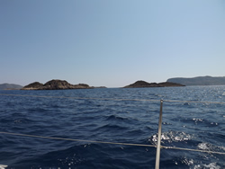 As we make our way through the islands the wind drops off further, as does our speed? The last trip we made through here we went out to sea behind the islands to seek cleaner wind, we did so again and again found it. We headed out to sea for an hour or so than "tacked" in heading straight for the entrance to Kekova Roads. We had hoped to overnight to Finike but this wind was failing and would probably disappear completely as apposed to continue through the night as per forecast?