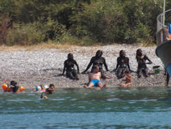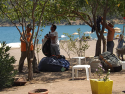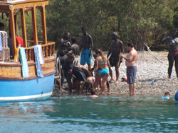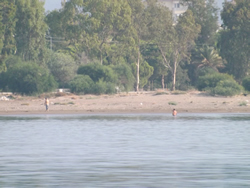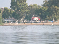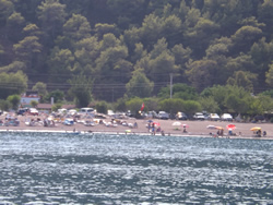 There seems to be an under lying activity on the shore line, it was drawn to my attention by Ann "there are more coloured people here than any where else I have seen anywhere in Turkey?" she retrieves the binoculars to investigate further. They are actually Turks covering themselves in black mud, drying off in the sun, then washing down in the seawater?
