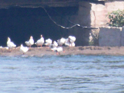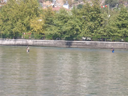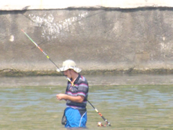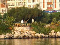 We follow the mole, and along side the river, passing the cooling water under our hull, into the waterfront park, men and women lining the waters edge fishing, sometimes whole families.