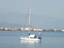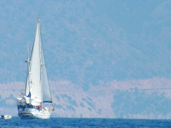 As we closed in on the land as it began appearing out of the mist I had been aware of a large catamaran coming directly down the coastline, we had been on a collision coarse for some time, although our speeds were slow? As we grew nearer, he was clearly going to overtake us and we could now hear his engine, even though he had all sails up, flapping about he was actually motor sailing. Under those two conditions, we had right of way, by now he was about four boat lengths away? I had notice from the markings that it was a charter vessel, I asked him "in forbidden Turkish hand gestures" what his intension's were as he should alter coarse - Ann asked "would you like sugar in your coffee". It was clear that he had no intension to avoid a collision as he walked over to the side of the vessel away from the steering position, the vessel was clearly on auto-pilot. I adjusted our coarse, allowing him to pass in front of us less than two boat lengths off, the slow speeds ensuring safe avoidance without too much of an issue? The boats coarse was taking him on so we thought toward Finike, we were wrong, as we approached the shore he turned to shore and made straight for the same entrance we were. We were amazed, but unsure if it was "arrogance or ignorance", charter boats have a bad reputation, but from what we see, most study the rules and air towards caution - this one was, well we were unsure what he was? Fortunately, once inside he chose a different anchorage to us - heaven knows what he would have been capable of in an anchorage?