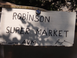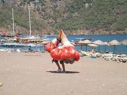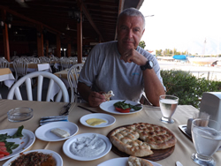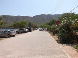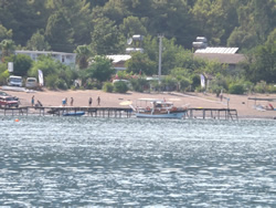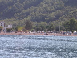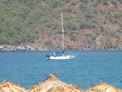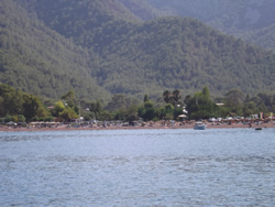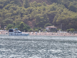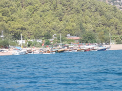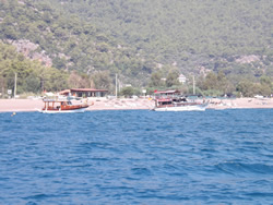 We head ashore, leaving our dinghy on the beach behind the trip boat pontoon, the promenade stretches a good mile along the beach with a vast collection of shops, cafes, restaurants, pensions/hotels. Some quite elaborate establishments, some no more than "shacks, knocked together", in true Turkish style, "If they are making a living, then we must be able too!" - all the same. We found the best stocked shop, then all one had to be careful of was the "sell by dates", we picked up some cheese that was out in early June! It was obvious that this stock could not be turned over, there just was not the demand, people were only buying water and incidentals, we saw no one eating ice creams, but every one had a fridge selling them.