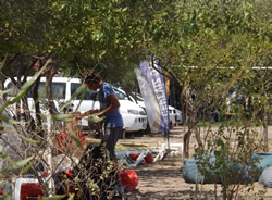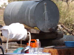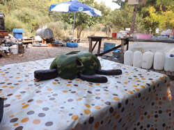 There is a dedicated washing area for dirty utensils, a tank fed from a well and suitable table decorations made from melons, we are told the pigs would eat the decorations that evening?