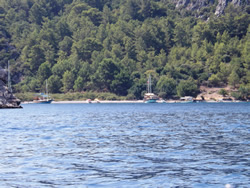 We turn into the entrance of Çineviz Limani, it's centre guarded by a large clump of rocks rising from the seabed. It is clear to us it's description in out Pilotage is inaccurate, it is very busy, not deserted? We enter to find the declared anchorage and in fact the entire beach lined with trip boats, we stay clear, anchoring in the deep water to the centre of the bay.
