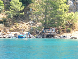 Even as we settle, boats come and go, mainly day trip boats but the odd gullet ventures in, on the shore a couple of shack type buildings. The first seems to be a base for individuals, two or three small fishing boats appear to use it for shelter, protection from the sun?