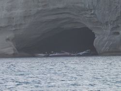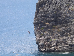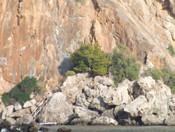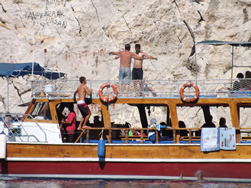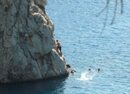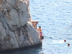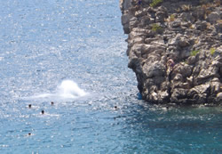 A trip boat enters the bay below us and the guests begin swimming, they then spend time looking for things to jump off, we watch the scale a rock towering out of the water.