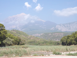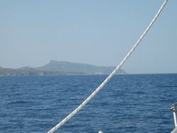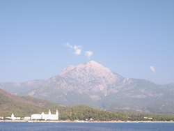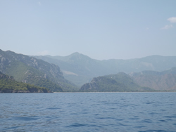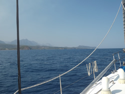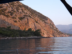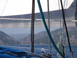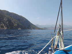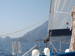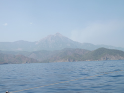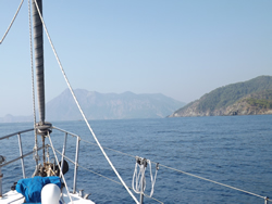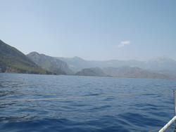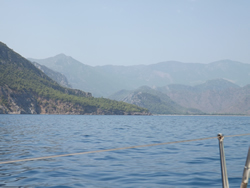 We make the coastal trip with no wind so engine on it is, the morning breezes should develop soon, the excellant back drop peeping out of the mist is Mount Solymnus (Tahtali Dagi)